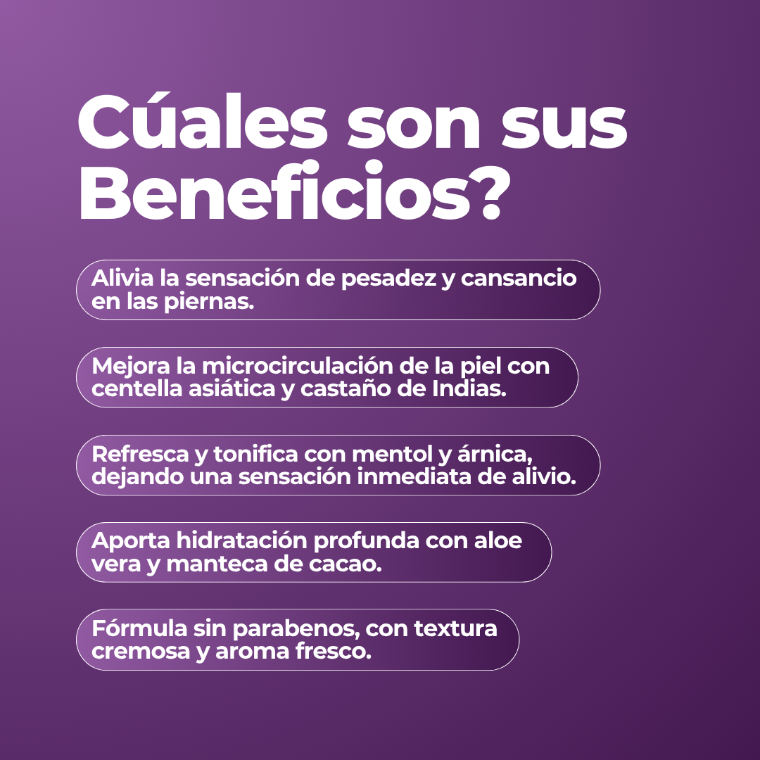 La Centella Asiática fortalece las paredes capilares y estimula la microcirculación, mientras el Castaño de Indiasmejora el retorno venoso y reduce la hinchazón y la pesadez. El Árnica Montana y el Mentol Natural activan la circulación, descongestionan y aportan un alivio inmediato, dejando una sensación de frescura y ligereza.