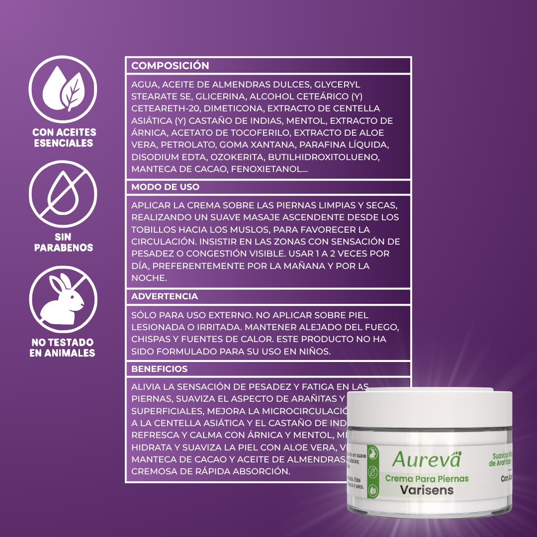 la crema Varisens™ está formulada con un sistema inteligente de triple acción que reactiva la circulación, fortalece las paredes capilares y calma la inflamación, abordando el origen real de las várices y arañitas, no solo sus síntomas.